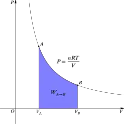 Pour un processus isotherme réversible, ceci correspond à l'intégrale de l'aire sous la ligne isotherme représentée par une température donnée dans le diagramme précédent :