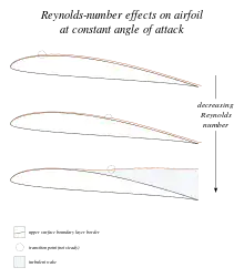 Plus le nombre de Reynolds augmente, et plus la couche limite qui entoure le profil a tendance à devenir turbulente tôt. Une couche limite turbulente se traduit par une traînée de friction plus importante qu’une couche limite laminaire (un peu moins du double). En revanche, elle permet d’atteindre un plus grand angle d'attaque (et ainsi un plus grand coefficient de portance) avant l’apparition du décrochage (voir Crise de traînée des profils).