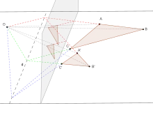 Toute paire de triangles homologiques peut être vue comme image par projection centrale d'une paire de triangles homothétiques ou translatés l'un de l'autre[25]. Il suffit de prendre un plan parallèle au plan contenant (d) et passant par O. Par projection centrale dans ce plan les droites images de (AB) et (A'C') (respectivement de (BC) et (B'C'), de (CA) et (C'A') sont parallèles. Cette correspondance permet de mettre en rapport la version projective et la version affine du théorème de Desargues[26].