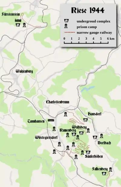 En , à cause de progrès peu satisfaisant du projet, la supervision du chantier fut transférée à l'Organisation Todt basée à Jedlina-Zdrój. Les prisonniers des camps de concentration voisins furent assignés à ce travail forcé. Ils furent déployés dans treize camps et un hôpital dans le voisinage des complexes. Le réseau de ce camp a été nommé Arbeitslager Riese et faisait partie du camp de concentration de Gross-Rosen. L'administration de cet Arbeitslager Riese et le camp du commandant (SS-Hauptsturmführer Albert Lütkemeyer) étaient situés à AL Wüstegiersdorf. De à , les prisonniers furent gardés par 853 soldats SS. Selon des données incomplètes, au moins 13 000 prisonniers ont travaillé pour ce projet, la plupart ont été transférés depuis le camp de concentration d'Auschwitz. Les documents permettent l'identification de 8 995 prisonniers. Tous étaient juifs, 70 % de Hongrie, le reste de Pologne, Grèce, Roumanie, Tchécoslovaquie, Pays-Bas, Belgique et Allemagne. Ils ont foré des tunnels dans la montagne, construit des routes et des voies de chemin de fer, transporté des matériaux de construction. La mortalité était très élevée à cause des maladies, de la malnutrition, de la fatigue, des travaux souterrains dangereux et des mauvais traitements infligés par les gardes allemands. Le nombre total estimé de victimes est de 5 000.