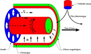 Un SPT est constitué de deux cylindres en céramique imbriqués d'environ 10 cm de diamètre[15]. À l'intérieur du cylindre interne et à l'extérieur du cylindre externe on trouvera des bobinages. Ils servent à générer un intense champ magnétique radial dans la zone de sortie du propulseur. Au fond de l'espace intra-cylindrique se trouve une anode avec le système d'injection du gaz. Une cathode creuse se situe à l'extérieur des cylindres. La pointe centrale forme un des pôles de l'électroaimant entouré par un espace annulaire, puis par la partie extérieure de l'électroaimant.