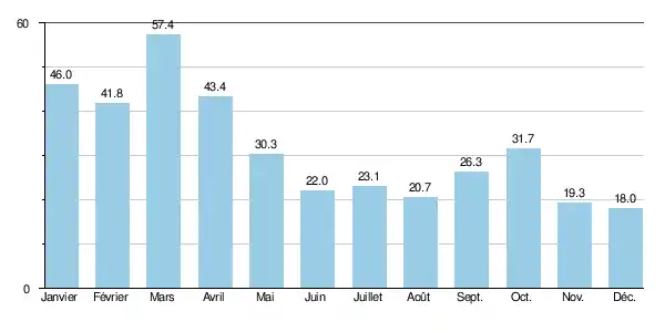 | Précipitations (mm) | 46 | 41,8 | 57,4 | 43,4 | 30,3 | 22 | 23,1 | 20,7 | 26,3 | 31,7 | 19,3 | 18 | 380 |