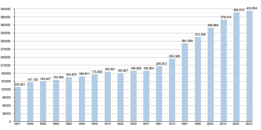 - Source : Statbel - Remarque: 1831 jusqu'à 1981=recensement; depuis 1990=nombre d'habitants chaque 1er janvier