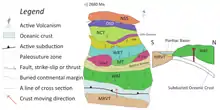 Certains des terranes ont été formés à partir des structures d'un arc volcanique, y compris la chaîne d'arc volcanique et le cadre de l'avant-arc.