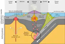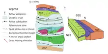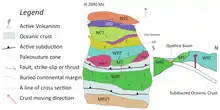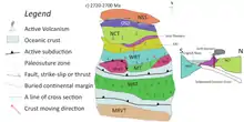 - Arc volcanique cadrant à l'ouest[31],[32],[33] - Marge continentale cadrant dans l'est