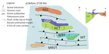 Avant 2 720 Ma, il y avait de nombreux morceaux de fragments de microcontinents que des croûtes océaniques en forme de conduits à tendance E-O (d'une étendue inconnue) séparent[64].