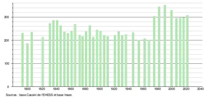 L'évolution du nombre d'habitants est connue à travers les recensements de la population effectués dans la commune depuis 1793. Pour les communes de moins de 10 000 habitants, une enquête de recensement portant sur toute la population est réalisée tous les cinq ans, les populations légales des années intermédiaires étant quant à elles estimées par interpolation ou extrapolation[25]. Pour la commune, le premier recensement exhaustif entrant dans le cadre du nouveau dispositif a été réalisé en 2006[26].