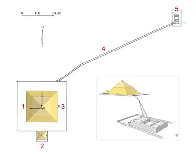 Tout d'abord, des joints alignés sur les quatre faces des corridors suggèrent que les entrées étaient primitivement situées à 12,6 mètres de l'actuelle entrée nord et à 11,60 mètres de l'entrée ouest[27]. La pyramide initiale devait avoir une base de 157 mètres et une hauteur de 125 mètres avec une inclinaison des faces de 58° (équivalentes à une pente de 8/5)[5].