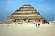 - la pyramide à degrés : pyramide en forme d'escalier, à l'origine une superposition de mastabas de bases différentes. Par exemple, la pyramide de Djéser comporte six gradins pour une hauteur de 60 mètres et une base de 109 × 121 mètres. Les tranches de maçonnerie, inclinées de 16° par rapport à la verticale, font 2,60 mètres de hauteur ;