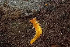 La larve (carnassière et éventuellement cannibale si la nourriture manque) se développe sous les écorces décollées[1] d'arbres morts sur pied, tombés, de souches ou de buches (chênes surtout). Elle joue un rôle dans les équilibres écologiques en limitant le développement d'autres larves d'insectes lignivores, xylophages ou corticoles. Il arrive qu'on en trouve des rassemblements dans le carton ondulé stocké à proximité de buches.