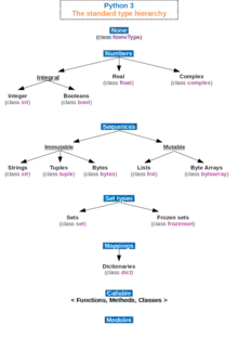 strsont des chaînes de caractères. À partir de la version 3.0, les caractères sont en Unicode sur 16 ou 32 bits ; les chaines d'octets sont des objetsbytes[31]. Dans les versions précédentes, ces objets étaient respectivement de typeunicodeetstr. Les objetsstretbytessont immuables. - Les objets