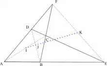 Chaque diagonale coupe les deux autres en créant des divisions harmoniques. De manière plus explicite la diagonale (BD) est coupée par les diagonales (AC) et (EF) en I et J tels que