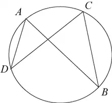 Un quadrilatère convexe est inscriptible si et seulement si les angles opposés sont supplémentaires[2] (leur somme est π radians, soit 180°). Ou de façon équivalente, si et seulement si chaque angle externe est égal à l'angle interne opposé. Cette propriété est en fait une variante du théorème de l'angle inscrit et de l'angle au centre.