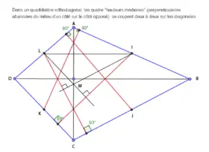 Dans un quadrilatère orthodiagonal (c'est-à-dire dont les diagonales sont perpendiculaires), les "hauteurs médianes" définies ci-dessus se coupent deux à deux sur des diagonales. Par exemple, les "hauteurs médianes" issues des milieux de [AD] et [AB] se coupent sur la diagonale issue de A.