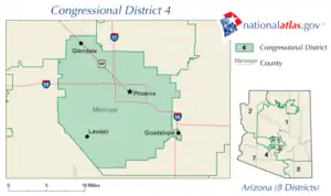Après le recensement de 2010, cette circonscription est devenue essentiellement le 7e district, tandis qu'un nouveau 4e district a été créée dans la partie ouest et nord-ouest de l'État, essentiellement rurale. Alors que l'ancienne 4e district était facilement la plus Démocrate de l'Arizona, le nouveau 4e est de loin la plus républicaine de l'Arizona et l'une des plus républicaines de l'Ouest. Dans toutes les élections présidentielles disputées depuis la création de l'actuel 4e district, elle a donné au candidat Républicain à la présidence sa plus grande marge dans l'État.