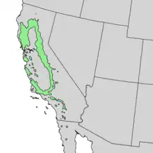 Ce chêne a des feuilles persistantes. Son port est très variable, il est souvent arbustif. On le rencontre dans de vastes zones en Californie aux États-Unis. Il est également endémique du nord de la Basse-Californie. Il se trouve généralement au pied des collines, et est plus abondant en basse altitude de la Sierra Nevada, mais il est aussi répandu dans chaînes côtières du Pacifique et dans les San Gabriel Mountains.