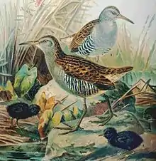 Le Râle d'eau (Rallus aquaticus) est une espèce d'oiseaux de la famille des rallidés. L'adulte mesure de 23 à 28 cm de long et a, comme les autres râles, un corps aplati latéralement lui permettant de se frayer plus facilement un chemin dans les roselières, son habitat préférentiel. Ses parties supérieures sont brunes et ses parties inférieures gris-bleu. Il a des rayures noires sur les flancs, de longs orteils, une courte queue et un long bec rougeâtre. Les jeunes sont similaires aux adultes, mais la partie gris-bleu du plumage de l'adulte est chamoisée chez les jeunes. Les nouveau-nés sont couverts d'un duvet noir, comme chez tous les autres râles.