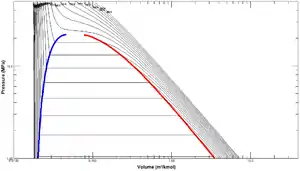 - Au point d'intersection du plateau et de la courbe bleue, le liquide a un volume molaire . Au point d'intersection du plateau et de la courbe rouge, le gaz a un volume molaire . Ces deux points sont aux mêmes pression et température et donnent les volumes molaires des deux phases liquide et gaz lorsqu'elles sont en équilibre dans ces conditions. On considère un point quelconque sur le plateau ; ce point représente un équilibre liquide-vapeur de volume molaire tel que . En ce point, la fraction de liquide vaut :