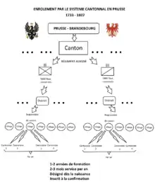 La façon de procéder des officiers-recruteurs conduisit parfois à des incidents ou des plaintes comme à Maastricht où un recruteur prussien a été exécuté en 1732. Le roi dépensa des millions de thalers pour payer les primes et le travail des recruteurs. Vers 1735, deux tiers des soldats enrôlés dans l'armée prussienne étaient étrangers[4] et avaient donc plus un statut de mercenaire. La vie était dure et les désertions fréquentes. Afin de stabiliser et de pérenniser son armée, le roi décida d'introduire un système de cantonnement nommé « règlement cantonal » le . Ce système de conscription quasi générale perdura jusqu'en 1807. C'est une année après la suppression du Saint-Empire romain germanique. Mais c'est surtout quelques mois après les défaites à Iéna et Auerstaedt face aux troupes françaises et dans la logique de la réforme de l'armée prussienne[N 3] et de la réorganisation de l'armée prussienne[N 4]. On assiste à un moment charnière entre l'ancienne (« Altpreußische Armee ») et la nouvelle armée prussienne ou armée néo-prussienne (« Neupreußische Armee »).