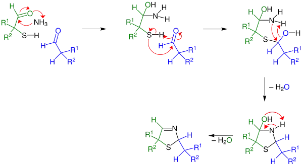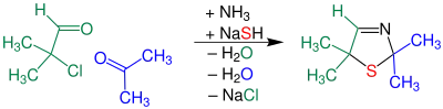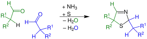 L'α-mercaptocétone réagit de manière irréversible avec un aldéhyde et de l'ammoniac pour former une 3-thiazoline : L'aldéhyde est ici l'autre composé carbonyle dans la réaction de cyclisation. Il s'agit d'une α-amino-alkylation d'un atome du carbone lié à S et O et donc polarisé et, pour encore plus de stabilisation, d'une cyclisation concertée avec le départ d'une molécule d'eau. Finalement une seconde déshydratation transforme la 3-thiazolidine en 3-thiazoline.