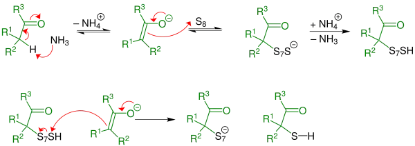 Une réaction de thiolation forme un intermédiaire α-mercaptocétone : L'α-thiolation est catalysée par une base - ici l'ammoniac- qui déprotone l'atome d'hydrogène en α de la cétone. La réaction est initiée par un énolate. Un cycle S8 du soufre élémentaire s'additionne sur la double liaison de l'énolate puis par protonation et réaction avec un autre énolate, forme une α-mercaptocétone et un polysulfure avec un soufre en moins qui par protonation et réaction avec d'autres énolates successivement forme de l'α-mercaptocétone jusqu'à ce qu'il soit lui-même une α-mercaptocétone.