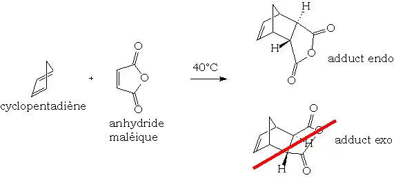 La réaction est renversable. Le composé endo est généralement obtenu le plus rapidement (conditions cinétiques). Si on laisse la réaction se prolonger un temps très long, l'équilibre sera alors en faveur du produit exo, plus stable thermodynamiquement.
