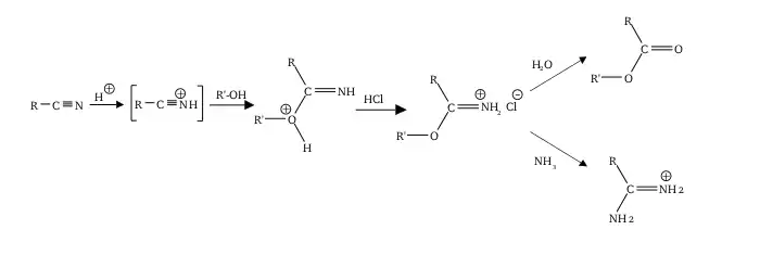 - (de) A. Pinner et F. Klein, « Umwandlung der Nitrile in Imide », Ber. Dtsch. Chem. Ges., vol. 11, no 2, , p. 1475–1487 (ISSN 0009-2940, DOI 10.1002/cber.18780110258, lire en ligne).