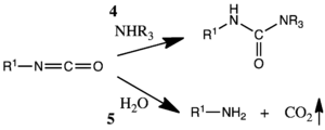 L'isocyanate peut ensuite être utilisé pour produire un carbamide en présence d'amines (4) ou produire des amines en présence d'eau (5).