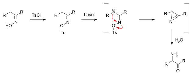 L'oxime est d'abord convertie en O-sulfonate, par exemple un tosylate sous l'action du chlorure de tosyle. L'ajout d'une base forme un carbanion qui déplace le groupe tosylate par substitution nucléophile pour former une azirine, qui est finalement hydrolysée en donnant l'aminocétone.