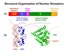 Les récepteurs nucléaires sont des protéines dont la taille varie classiquement entre 40 et 100 kilodaltons (kDa). Ils ont été subdivisés arbitrairement en 5 (ou 6) domaines (A, B, C, D, E (F)).