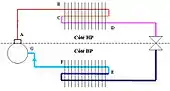 Comme dessiné sur ce schéma, le compresseur met en circulation le réfrigérant. Il sort de l’orifice HP (haute pression) du compresseur à l’état gazeux, plus chaud qu'il n'y est entré. Il traverse alors le côté HP en commençant par le condenseur.