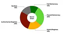 Selon l'indice de démocratie compilé par l'Economist Intelligence Unit, il existe 34 régimes hybrides, représentant environ 20 % des pays, englobant 17,2 % à 20,5 % de la population mondiale[51].