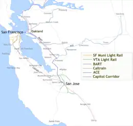 L'agglomération est desservie par de nombreux réseaux de transport public et par trois aéroports internationaux (SFO, OAK et SJC). Six réseaux de bus couvrent l'aire urbaine et quatre réseaux ferroviaires express régionaux, ainsi que des services ferroviaires régionaux, notamment BART, ainsi que plusieurs lignes de ferry.
