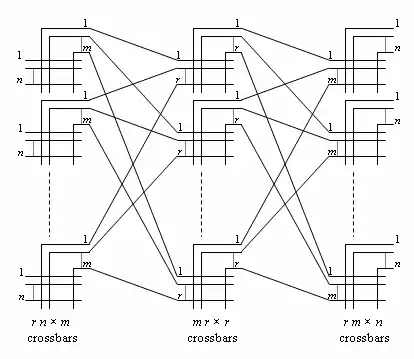 Les réseaux Clos sont architecturés en trois niveaux : ingress (entrée) , middle (intermédiaire) et egress (sortie). Chaque étage est construit avec un certain nombre de switches en crosssbar (voir diagramme), appelés souvent crossbars. Chaque appel entrant dans un commutateur ingress peut être routé via un commutateur middle vers le commutateur egress correspondant à la destination. Un commutateur middle n'est utilisable que si le lien ingress-middle et le lien middle-egress sont disponibles.