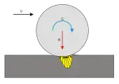 En étant enfoncé sous l'effet de l'effort presseur, le plan crée un bourrelet de matière. Ce bourrelet constitue un obstacle au mouvement, une pente que le cylindre doit monter. Sous l'effet de l'effort moteur, l'action de contact plan/cylindre FC se déplace, et le pivotement autour du point de contact devient possible lorsque ce point d'application est au sommet du bourrelet.