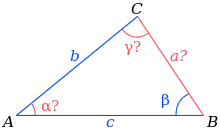 En géométrie euclidienne, la donnée de trois des éléments du triangles, dont au moins un côté[1], est nécessaire et suffisante à la résolution du triangle, l'un des cas de résolution pouvant admettre deux solutions. En géométrie sphérique ou hyperbolique, la donnée des trois angles est également suffisante. La résolution fait intervenir la trigonométrie, en particulier certaines relations classiques dans le triangle comme le théorème d'Al-Kashi, la loi des sinus, la loi des tangentes, et la somme de ses angles.