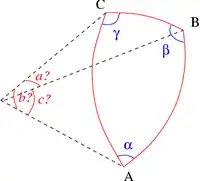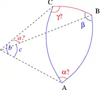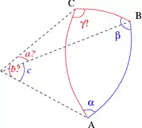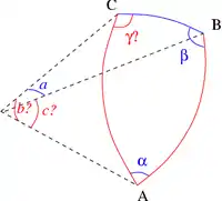 Dans le cas où les trois angles sont connus, les côtés s'obtiennent par une variante du théorème d'Al-Kashi pour les angles. Les formules donnant les côtés sont semblables à celles du cas de résolution complémentaire (les trois côtés connus) :
