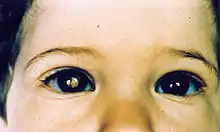 - une leucocorie (reflet blanchâtre de la pupille, apparaissant sous un certain angle, et parfois mis en évidence sur des photos prises au flash[10])