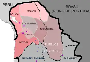 Le territoire du Haut-Pérou, qui fait aujourd’hui partie intégrante de la Bolivie, se composait de quatre intendances ou provinces et de deux gouvernements politiques militaires. Une des provinces était celle de Chuquisaca, dans le chef-lieu de laquelle, Chuquisaca (appelée aussi La Plata ou Charcas, et actuellement Sucre), l’Audiencia royale de Charcas avait son siège.