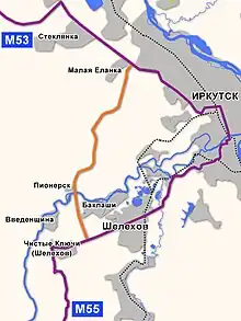 et Contournement d'Irkoutsk (Branche de la R255, vers la R258), km 1865- Fin de la R255, devient la route de Moscou à Vdovina en direction d'Irkoutsk, km 1866