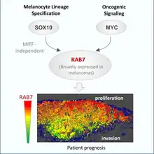 Les cellules de mélanome conservent une mémoire de développement qui reflète un câblage unique des voies de trafic des vésicules. Rab7 est considéré comme contrôlant le potentiel prolifératif et invasif de ces tumeurs agressives lors de l'identification d'un groupe de gènes endolysosomaux enrichis en mélanome. La dégradation associée aux lysosomes, une caractéristique universelle des cellules eucaryotes, peut être détournée d'une manière dépendante du type de tumeur et du stade. Trouver que RAB7 est contrôlé par SOX10 et MYC de manière indépendante du MITF a des implications fondamentales et translationnelles importantes[19]. Sox10 n'est pas inhibé par des mécanismes qui régulent à la baisse le MITF, dont certains incluant des mutations BRAF, sont relativement fréquents dans les mélanomes malins. Cela peut assurer une mémoire de développement dans l'expression de RAB7. On suppose que la régulation à la baisse de RAB7 dans le front invasif des mélanomes agressifs est modulée par des mécanismes de type épithélial à mésenchymateux, tels que ceux récemment décrits comme étant à la base du commutateur transcriptionnel associé aux phénotypes prométastatiques. En d'autres termes, il existe une dépendance inhérente des cellules de mélanome à la petite GTPase RAB7, identifiée au sein d'un groupe de gènes lysosomaux qui distingue cette tumeur maligne de plus de 35 types de tumeurs. Des analyses dans des cellules humaines, des échantillons cliniques et des modèles de souris ont démontré que RAB7 est un conducteur de mélanome induit précocement dont les niveaux peuvent être réglés pour favoriser l'invasion tumorale, définissant finalement le risque métastatique. Il est important de noter que les niveaux et la fonction du RAB7 étaient indépendants du MITF et que le modulateur maître neuroectodermique SOX10 et l'oncogène MYC sont des régulateurs clés du RAB7a.