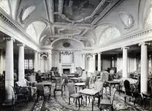 La décoration de l'Aquitania lui vaut le surnom de « The Ship Beautiful » (« Le navire de beauté »)[17]. Elle est l'œuvre d'Arthur Joseph Davis, notamment à l'origine de l'Hôtel Ritz de Londres avec son associé Charles Mewès (ce dernier s'occupe, pour sa part, de la décoration des paquebots allemands Imperator et Vaterland à la même époque)[6]. La première classe offre de nombreuses salles communes, notamment un grand salon de style palladien, un petit salon, deux jardins d'hiver, deux salons de correspondance et un fumoir de style Restauration[49]. S'y ajoutent une salle à manger de style Louis XVI (nommée, contrairement à l'habitude, « restaurant ») et un grill[50]. S'y ajoutent une piscine et un gymnase. En , au cours de la construction, la compagnie a par ailleurs décidé de retirer les bains turcs initialement prévus, à la différence des paquebots concurrents[51].
