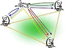 Avec une configuration multistatique, la connaissance des retards entre les échos provenant de trois émetteurs en se réfléchissant sur une même cible permet de déterminer les coordonnées de la position de cette cible (intersection de trois ellipsoïdes de révolution, comme la figure ci-contre. De plus, en notant les décalages Doppler des signaux, il est possible de déterminer explicitement les composantes du vecteur vitesse de la cible. Si l'on dispose d'au moins trois géométries différentes de couples émetteur-récepteur non liés, alors le vecteur vitesse obtenu est un vecteur vitesse absolu et non un simple vecteur radial comme dans un radar monostatique ou bistatique[2].
