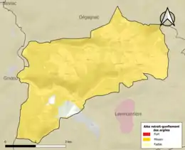 Le retrait-gonflement des sols argileux est susceptible d'engendrer des dommages importants aux bâtiments en cas d’alternance de périodes de sécheresse et de pluie. 96,8 % de la superficie communale est en aléa moyen ou fort (67,7 % au niveau départemental et 48,5 % au niveau national). Sur les 69 bâtiments dénombrés sur la commune en 2019, 67 sont en aléa moyen ou fort, soit 97 %, à comparer aux 72 % au niveau départemental et 54 % au niveau national. Une cartographie de l'exposition du territoire national au retrait gonflement des sols argileux est disponible sur le site du BRGM[22],[Carte 2].