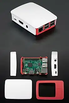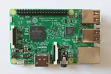 Le Raspberry Pi est un nano-ordinateur monocarte à processeur ARM de la taille d'une carte de crédit conçu par des professeurs du département informatique de l'université de Cambridge dans le cadre de la fondation Raspberry Pi[3].