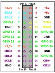 - (en) « Raspberry Pi GPIO Connector », sur Elinux.org (consulté le ).