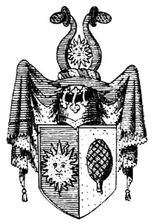 Les armoiries de la famille montrent un soleil doré dans un champ bleu à droite et une noix de cèdre verte dans un champ doré à gauche dans un blason divisé. Sur le casque avec des lambrequins bleues et dorées le soleil doré entre deux cornes de buffle bleues décorées sur le dessus d'une noix de cèdre verte.