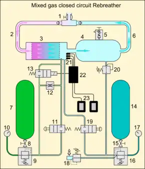 - ceux à mélange variable, les appareils à circuit fermé (en anglais CCR, Closed Circuit Rebreather). L'appareil injecte un mélange via une commande mécanique (mCCR : mechanical CCR), électronique (eCCR : electronical CCR) (ou via les 2 : hCCR hybrid CCR) du O2, le plongeur dispose d'une source de gaz distinct, le diluant pour faire varier la composition du mélange. Ce type de recycleur nécessite, contrairement au SCR une mesure constante du taux de O2. Usuellement 3 sondes sont utilisées afin de garantir la fiabilité de la mesure. Quelques, très rares SCR, dits SCR à fuite pilotée électroniquement (comme le RI-2000 d'Olivier Isler) ont une injection de O2 et peuvent donc faire varier la composition du mélange respiré.