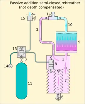 Le plongeur respire normalement sur l'embout qu'il a en bouche. Au moment de l'expiration, l'air n'est pas relâché dans le milieu aquatique mais est stocké dans la poche puis le CO2 est fixé chimiquement dans la cartouche de chaux présente dans l'appareil. Le solde de l'oxygène restant peut ainsi être réutilisé par le plongeur qui inspire cet air purifié de son CO2.