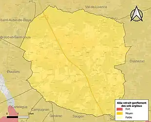Le retrait-gonflement des sols argileux est susceptible d'engendrer des dommages importants aux bâtiments en cas d’alternance de périodes de sécheresse et de pluie. La totalité de la commune est en aléa moyen ou fort (67,4 % au niveau départemental et 48,5 % au niveau national). Sur les 811 bâtiments dénombrés sur la commune en 2019, 811 sont en aléa moyen ou fort, soit 100 %, à comparer aux 84 % au niveau départemental et 54 % au niveau national. Une cartographie de l'exposition du territoire national au retrait gonflement des sols argileux est disponible sur le site du BRGM[22],[Carte 2].